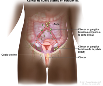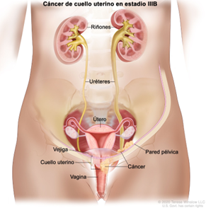 El cáncer está creciendo en la pared pélvica, y/o ha crecido en el tercio inferior de la vagina, y/o ha bloqueado el flujo de orina (hidronefrosis), causando que los riñones no funcionen. El cáncer se ha diseminado hacia los ganglios linfáticos.