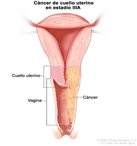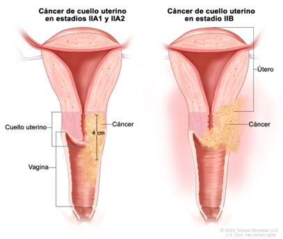el cáncer se diseminó del cuello uterino a los dos tercios superiores de la vagina, pero no se diseminó al tejido que rodea el útero. El estadio IIA además se divide según el tamaño del tumor.