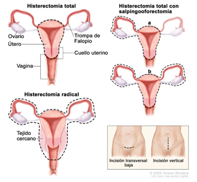Figura de Histerectomía. En una histerectomía total, se extirpan el útero y el cuello uterino. Estos procedimientos se realizan mediante una incisión transversal baja o una incisión vertical.